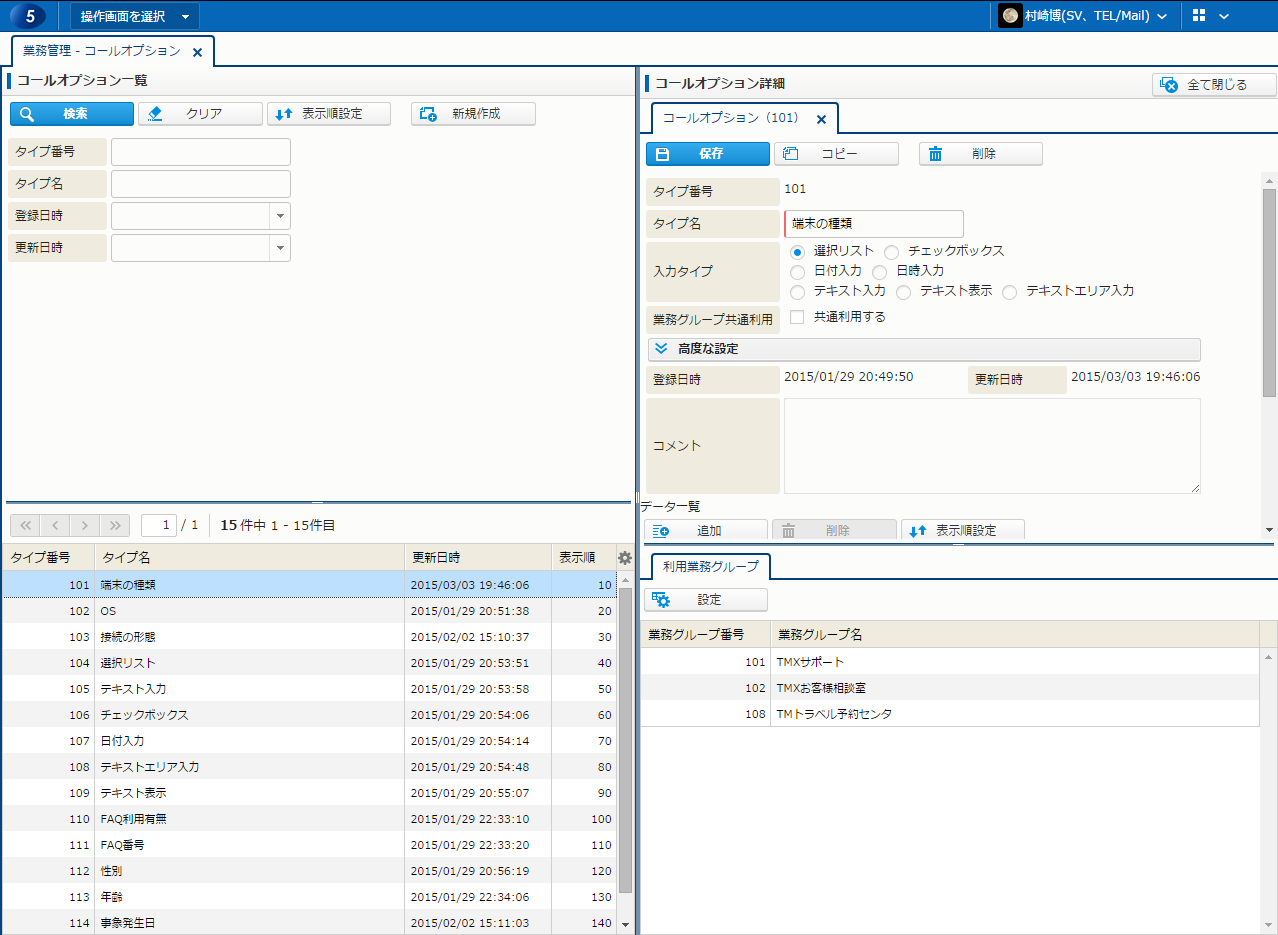 | 業務グループ共通利用 | - | チェックボックス | - | 共通利用フラグ。 コールオプションタイプを業務グループ共通で扱う場合に選択する。 |