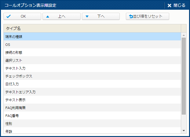 | 表示順設定 | コードの表示順を設定する。 ("選択リスト" の場合) | コールオプション更新権限 |