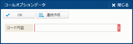 | 連続作成 | 現在表示している内容で新規作成し、その後続けて新規作成するための [コールオプションデータ] サブウィンドウを表示する。 | - |