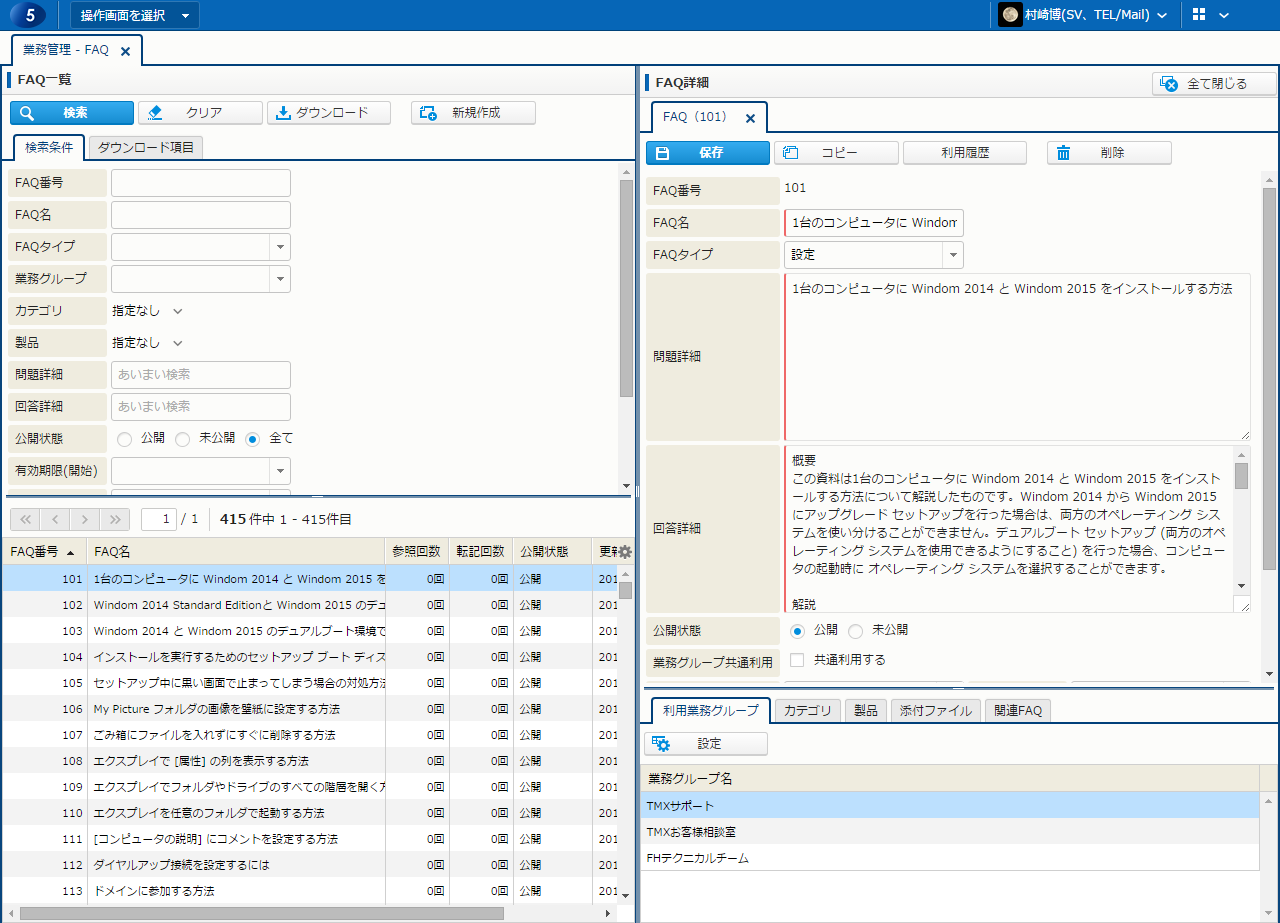 | 操作 | この FAQ に対する操作。"参照"、"転記" がある。 |