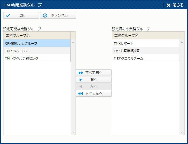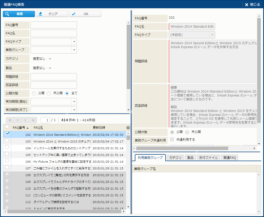 | OK | 検索結果の一覧からFAQ を選ぶと、このボタンが押せるようになる。 [OK] を押すと、関連 FAQ を追加できる。 |
