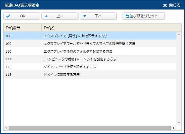| 表示順設定 | 関連 FAQ の表示順を設定する。 [表示順設定] サブウィンドウが開く。 |
