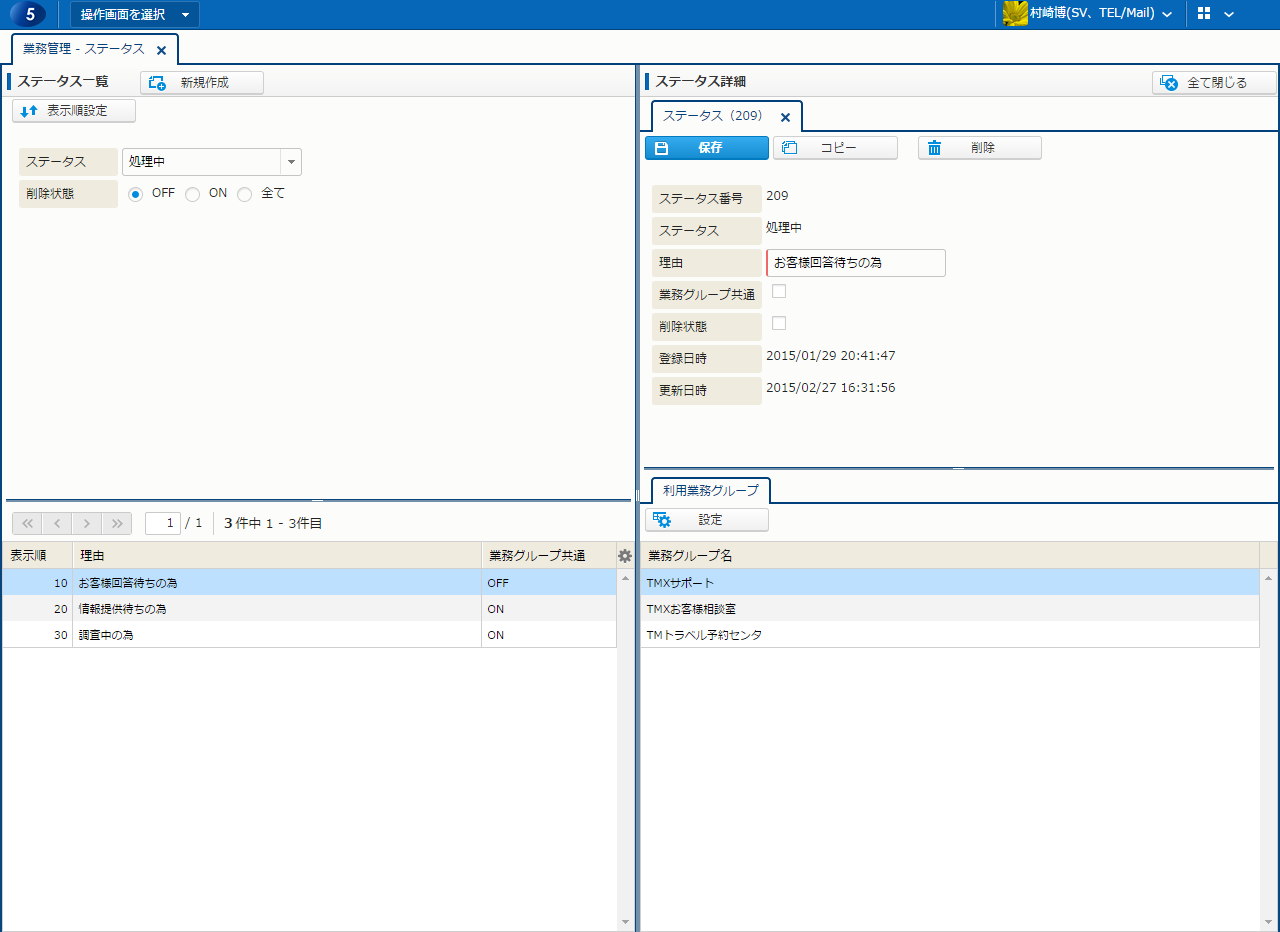 | 業務グループ名 | - | - | - | ステータスを利用する業務グループの名前。 |