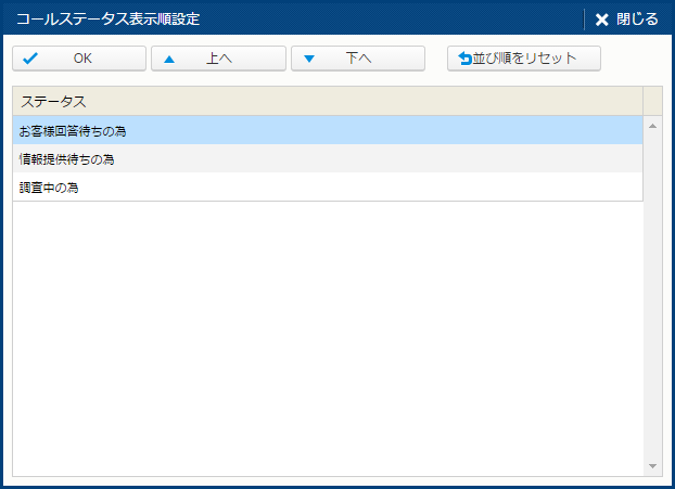 | 表示順設定 | 表示順を変更する。 | コールステータス更新権限 |
