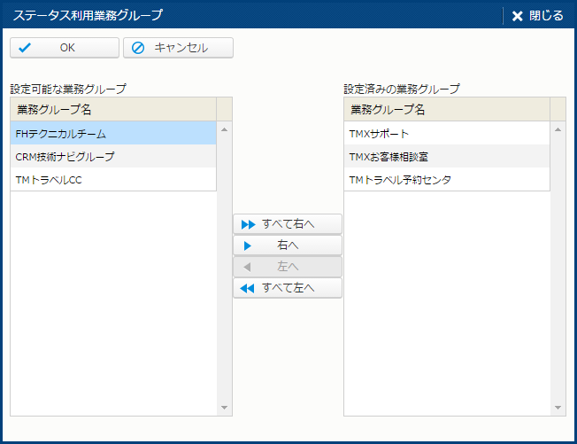 | 設定 | 利用する業務グループを設定する。 [ステータス利用業務グループ] サブウィンドウが開く。 |