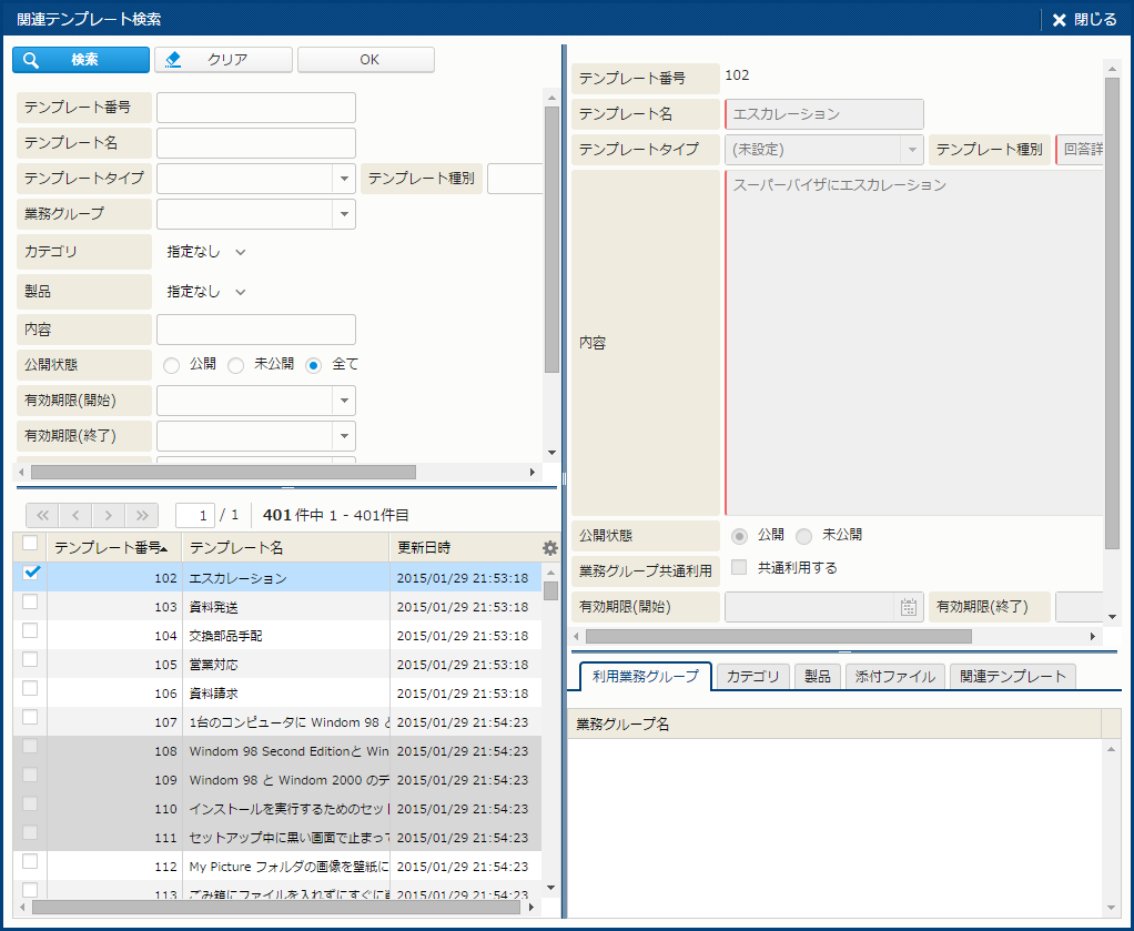 | OK | 検索結果の一覧からテンプレートを選ぶと、このボタンが押せるようになる。 [OK] を押すと、関連テンプレートを追加できる。 |