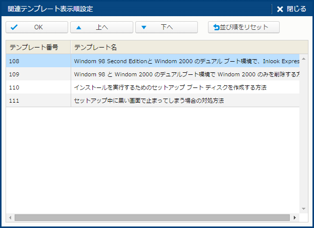 | 表示順設定 | 関連テンプレートの表示順を設定する。 [表示順設定] サブウィンドウが開く。 |