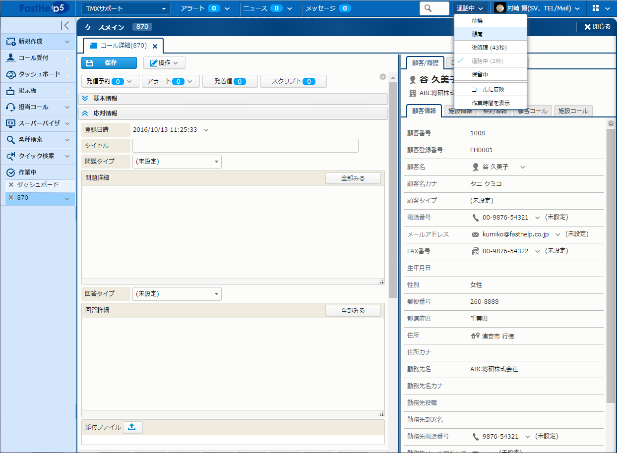 - 後処理: 通話終了後に、応対内容を記録している状態。