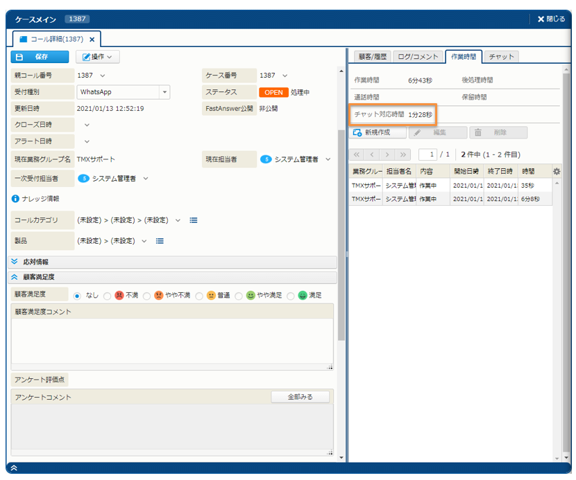 チャット対応時間は、[ケースメイン] - [作業履歴] タブで確認できます。