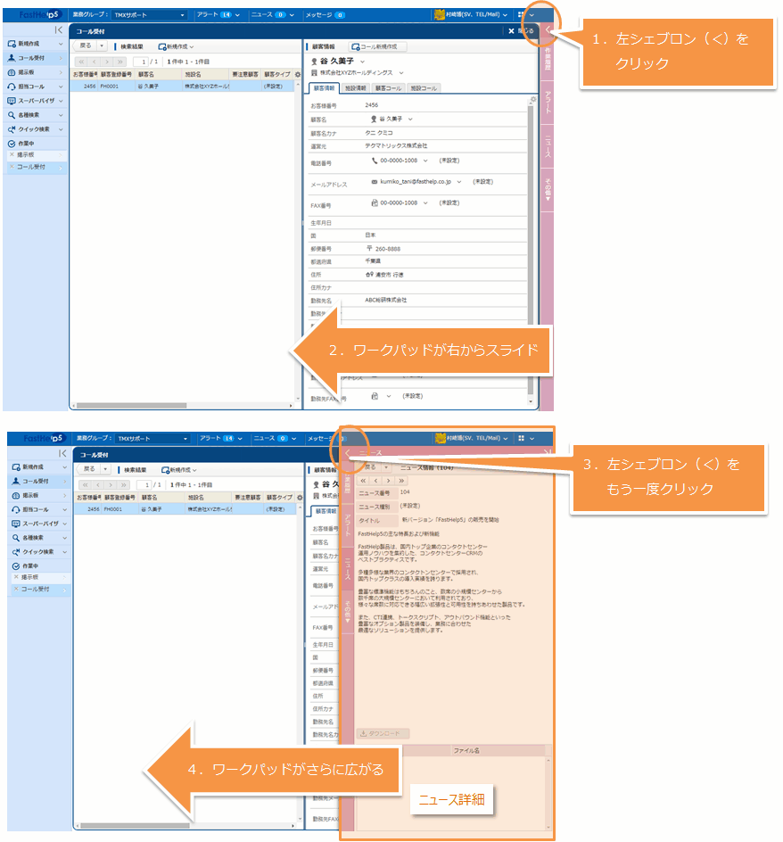 ワークパッドは、コール対応中によく利用する便利機能を [コール管理] 画面の右側に集めたものです。