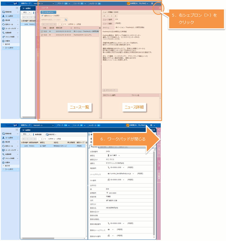 コンタクトセンタ内での連絡事項 (= "ニュース" ) の一覧が表示されます。クリックすると、ニュースの詳細が確認できます。
