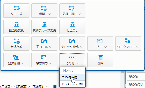 [ケースメイン] 画面 で、 [操作] - [その他] - [ToDoを作成] をクリックすると、[ToDo] 画面が自動的に開き、コールの内容をコピーした ToDo が作成、保存されます。