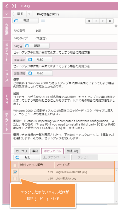 転記とは、FAQ の情報を他の画面にコピーすることを意味します。他の画面で新たに入力する必要がなくなり、入力時間の節約になります。