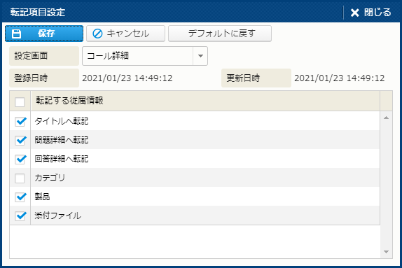 例えば、転記先画面が [コール詳細] の場合は、業務の関係で [カテゴリ] は常に転記しないという決まりの場合は、設定で [カテゴリ] の転記をオフにしておく、という使い方ができます。